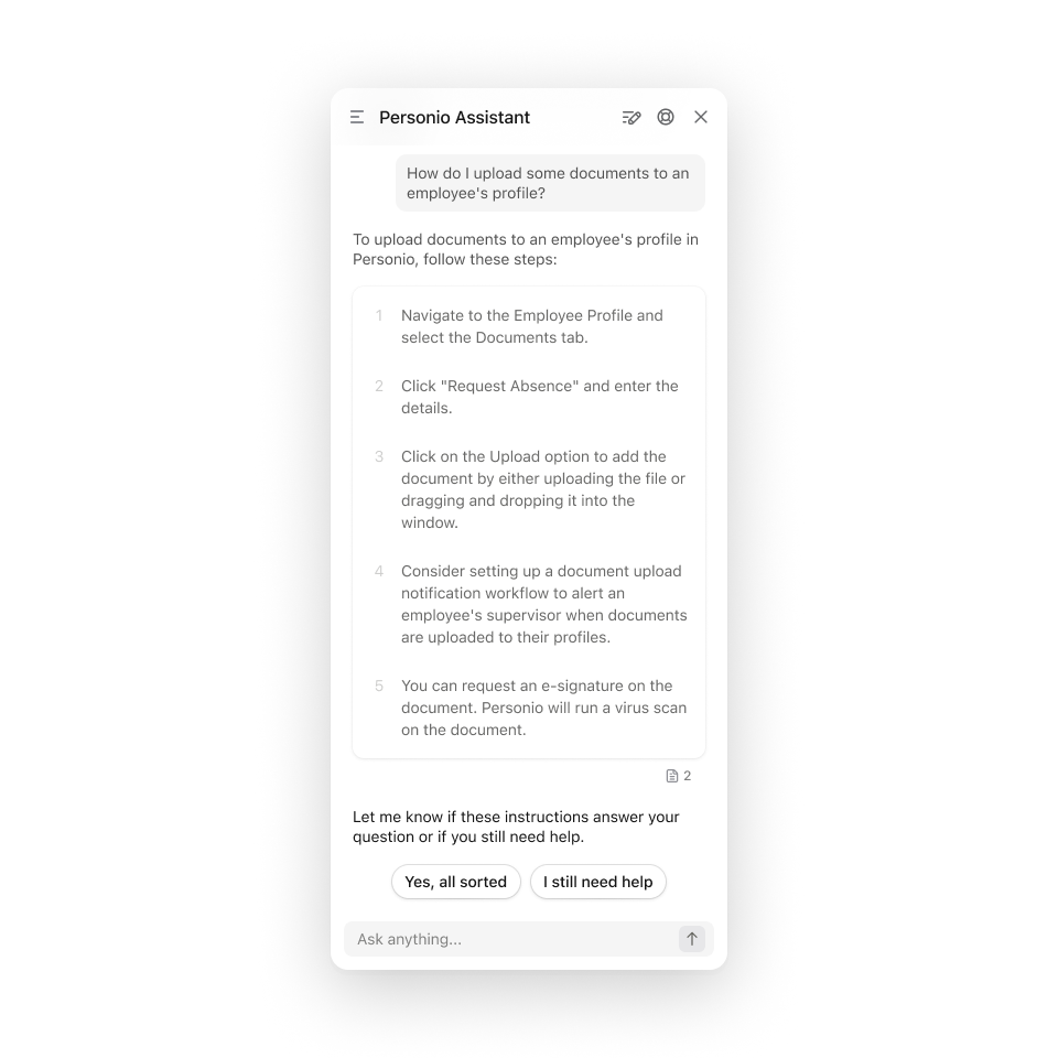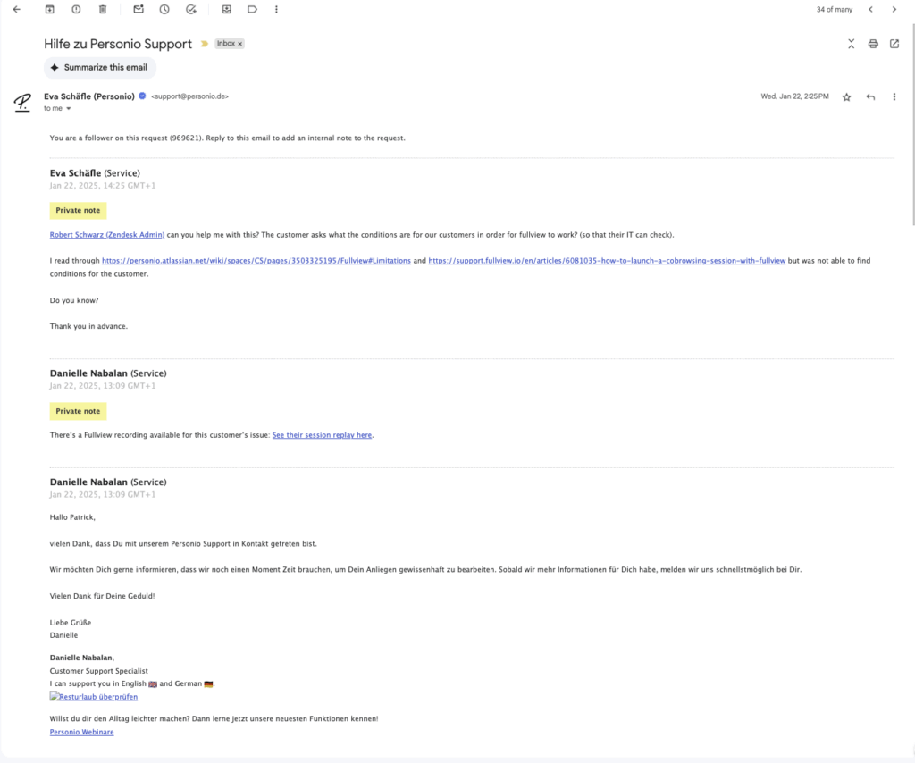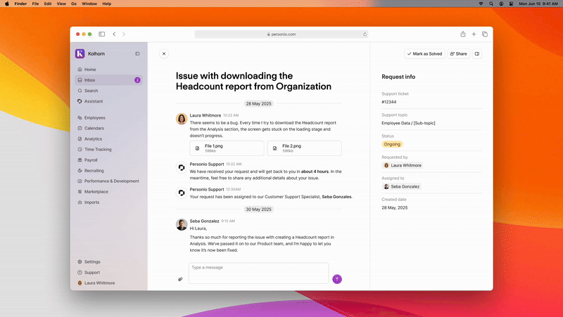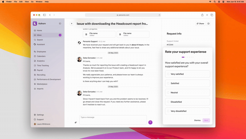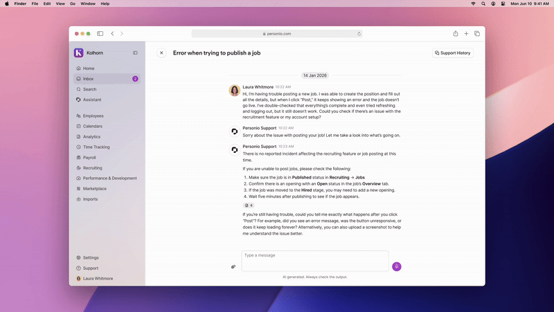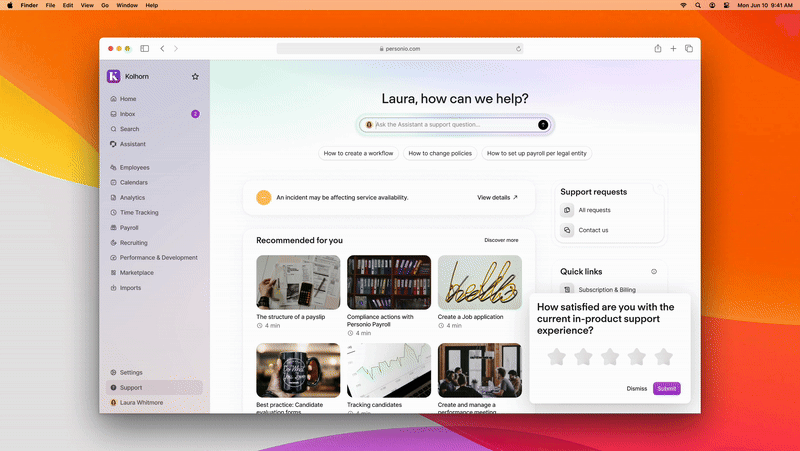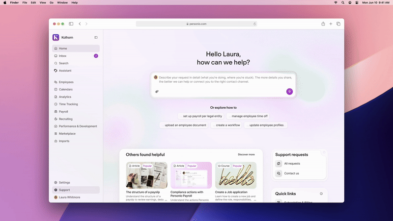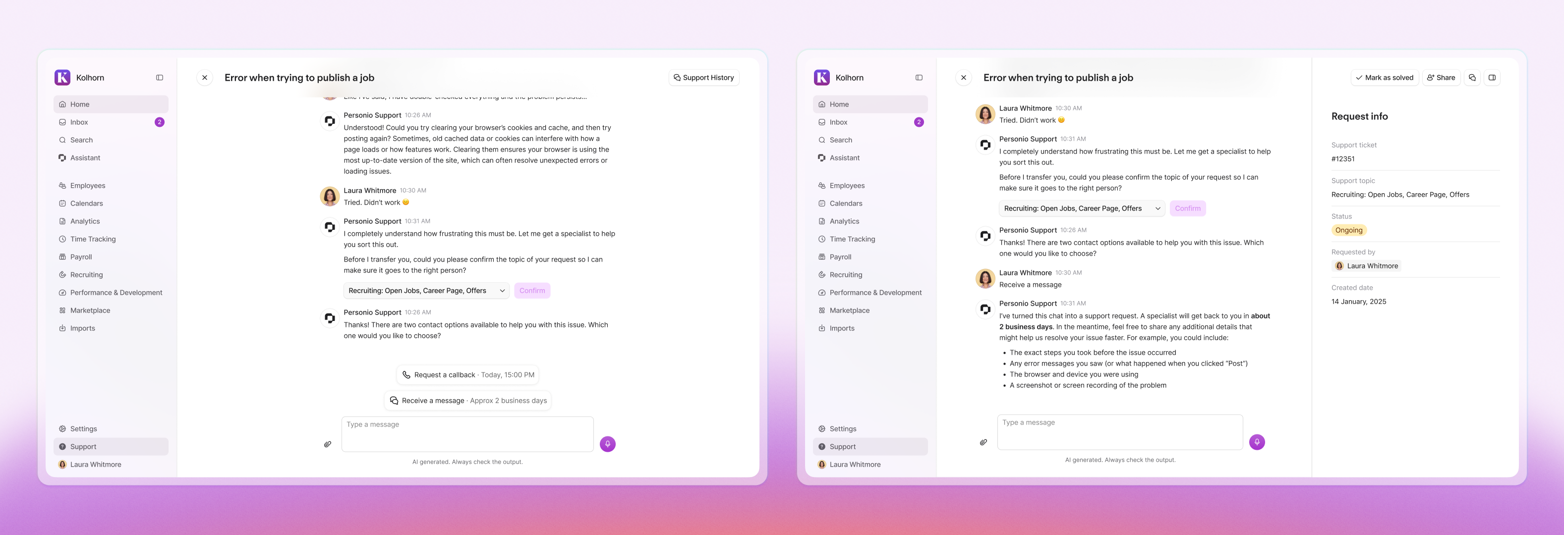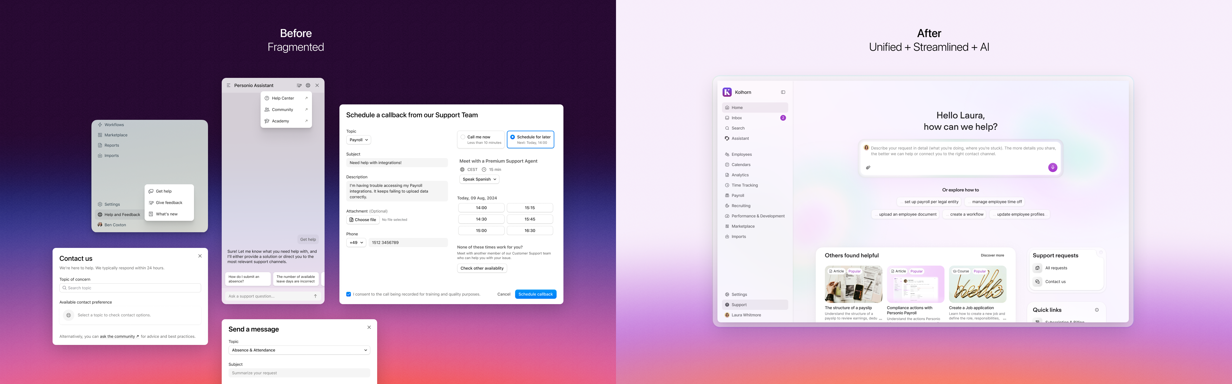 Support was one of Personio’s biggest pain points, cited in customer surveys as the top reason users considered leaving the product. Many found it difficult to navigate the various channels, know where to start, or understand what to expect after submitting a request.